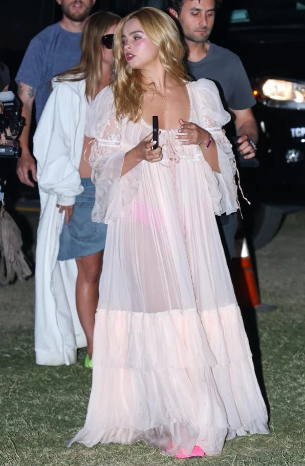 Addison Rae performing (& also just walking) around Coachella in this Chloe dress. We’ll get to her new music in a second - she performed Aquamarine this go around but chances of her coming back up on stage this weekend to perform her new single Headphones On? I’d bet on it. It worked really, really well for Sabrina Carpenter last year (she intro’d Espresso @ Coachella) so maybe this will be the song of the summer?