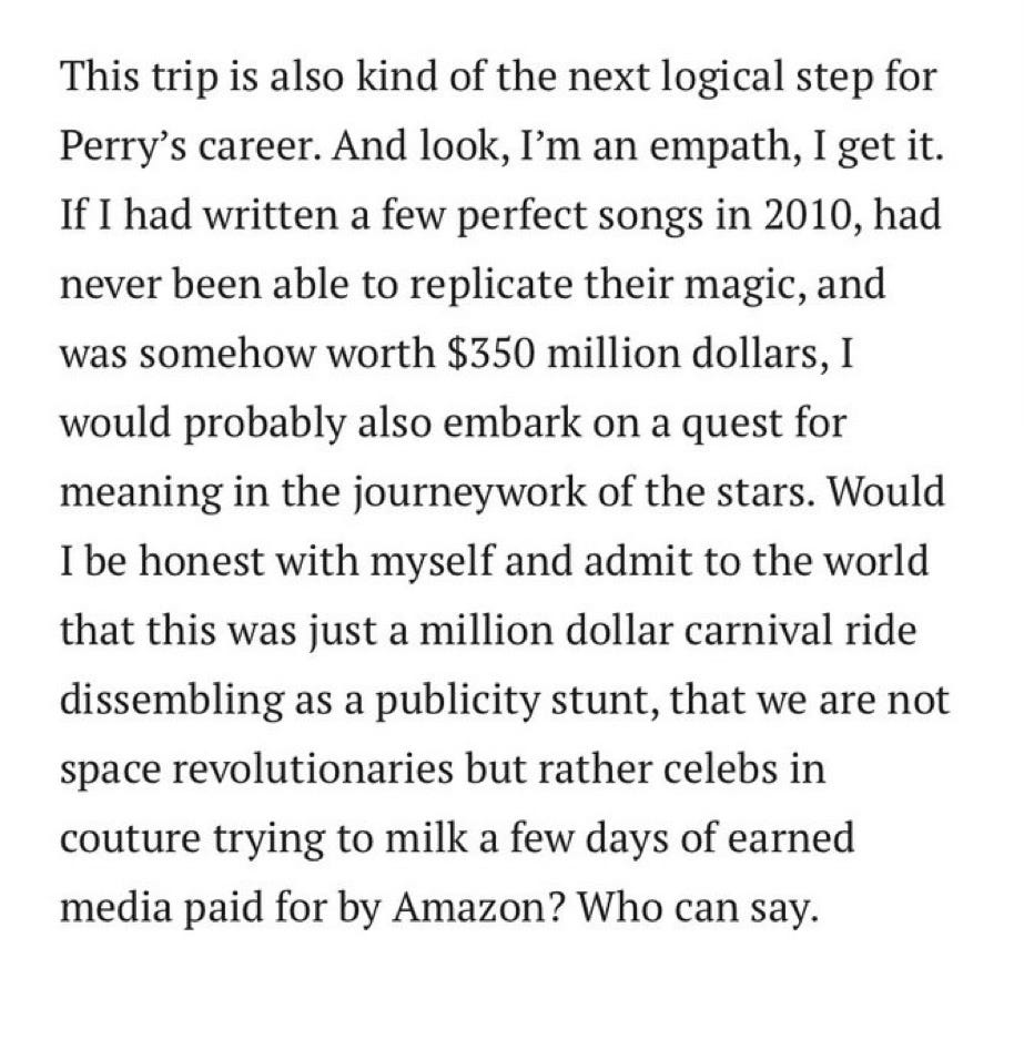 like get a grip. do you have a pulse on what’s happening in the world right now? I don’t have much else to say on the topic solely because Pitchfork reviewed Katy going to space & said everything I was thinking much more eloquently than I could have.